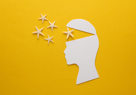 Paper-cut open human head with sea stars on yellow background. travel concept