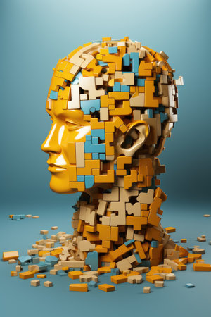 Open your mind, mental health concept, creative thinking. Paper silhouette of human head and dice on yellow background