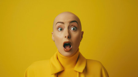 Cute surprised girl posing with orange gerbera daisy flower on her ear. Dressed in a yellow sweater. Isolated girl with bright yellow background studio. Girl looking surprised.
