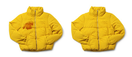 Dirty warm jacket before and clean one after dry-cleaning, collage on white background