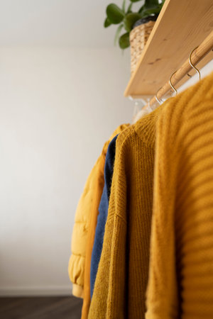 Warm yellow jacket and woolen knitted jumper. Fashion outfit. Bright trendy colors. Home storage. Small space organizing