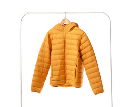 Yellow winter jacket with hood isolated on white background. Vector illustration.