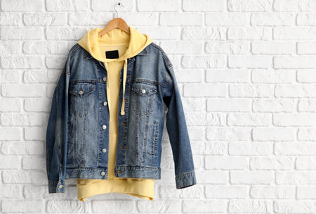 Hanger with stylish yellow hoodie and jeans jacket on white brick background