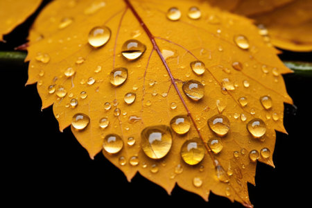 a close-up of raindrops on a golden autumn leaf, created with generative ai