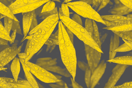 Beautiful fresh peony leaves with raindrops after rain in yellow and grey colors. Natural background of beautiful leaves. Trendy colors of 2021.