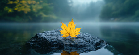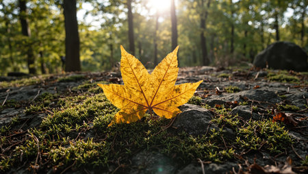Tranquil yellow birch leaf on mossy rock in dappled sunlight