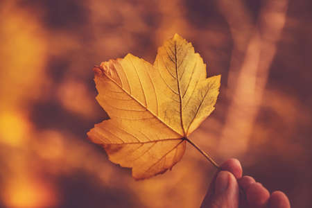 Closeup photo of a beautiful yellow maple leaf in human hand over autumnal bokeh background, beauty of autumn nature