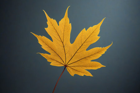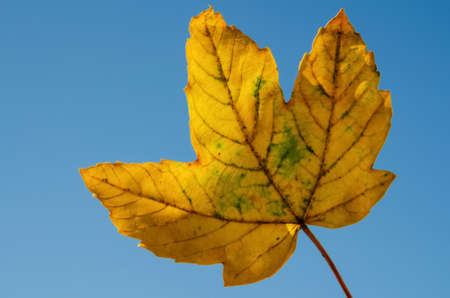 Close-up yellow maple leaf isolated on blue background. Autumn concept. Multicolored leaf against clear sky with copy space.