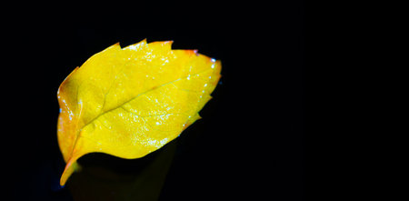 Yellow leaves with water drops on black wooden background, flat lay. Space for text