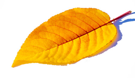 This leaf showcases a stunning gradient between yellow and orange, with detailed veins highlighted under the sunlight. The clean background brings focus to the vibrant colors and smooth texture