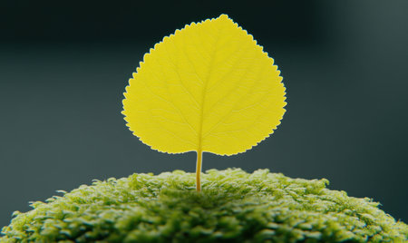 Single yellow leaf sprouting from moss, nature background, new life concept, environmental imagery