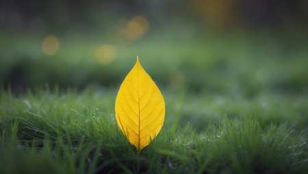 AI Generated. Vibrant Yellow Leaf Surrounded by Lush Green Grass in Natural Setting