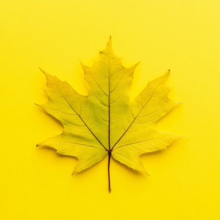 A bright and cheerful arrangement of yellow autumn leaves on a yellow background, creating a vibrant and monochromatic fall design.
