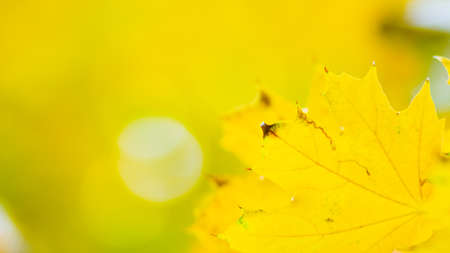 Yellow maple leaves on a blurred background. Autumn background with maple leaves. Creative wallpapers. Copy space