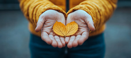 Hands Cupped Holding a Golden Autumn Leaf, Symbolic of Natures Beauty, Tranquility, and Change.