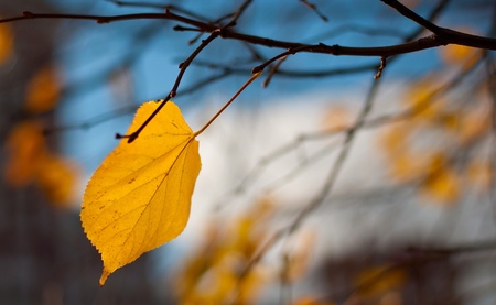 Autumn leaves against the blue sky. Autumn background with yellow leaves