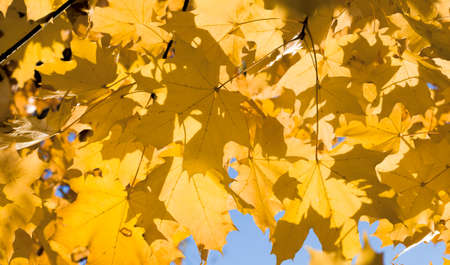 yellowed maple leaves on a blue sky background in autumn on a sunny day.