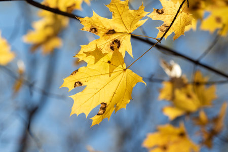 Yellow maple leaves on blue sky background, shallow depth of field.