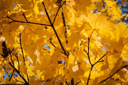 Autumn maple leaves. Yellow-orange maple leaves in the crown of a tree, view from below.