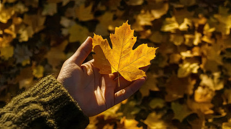 Close-up of a hand holding a golden maple leaf, with warm fall sunlight casting long shadows across the autumn landscape.