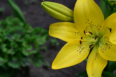 Beautiful yellow delicate lilies on a flower bed in the garden. Beautiful floral background for the designer. Copy space.