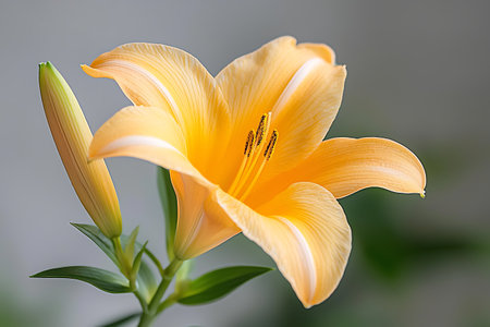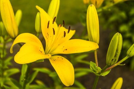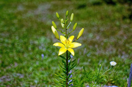 gorgeous yellow lily with beautiful bokeh on a green meadow. Summer close up