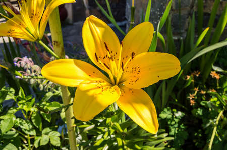 yellow lilies folwers named Fata Morgana grwoing in garden at sunlight.