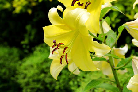 Beautiful yellow Lilium flowers against fresh green leaves background in the garden