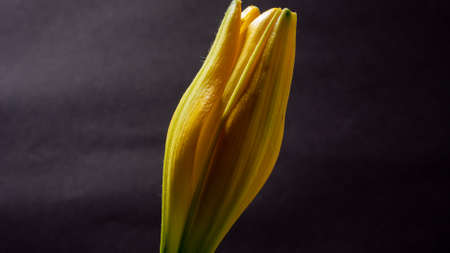 Yellow lilies on dark background, close-up. Botanical beauty and tranquility concept