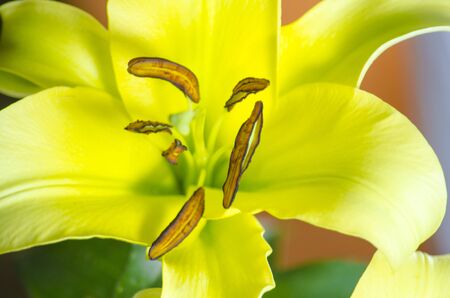 Close up fresh yellow Lily flowers in garden, clearly see stamen and pollen.