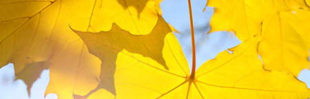 Golden yellow autumn maple leaves close-up, clear blue sky. Natural pattern, texture, background, wallpaper, graphic resources. Panoramic image, copy space. Seasons, fall, nature, forest, changing