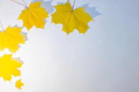 Autumn background with maple leaves. Yellow maple leaves on a blurred background. Copy space