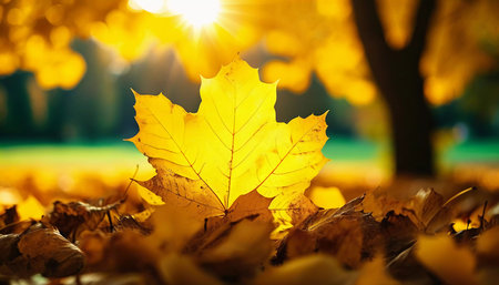 Amidst a carpet of yellow leaves, a single vibrant leaf catches the sunlight, illuminating the beauty of autumn during a tranquil Indian summer afternoon.