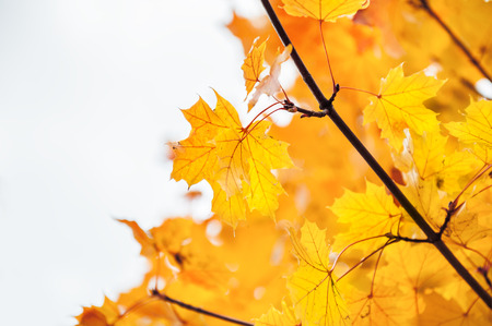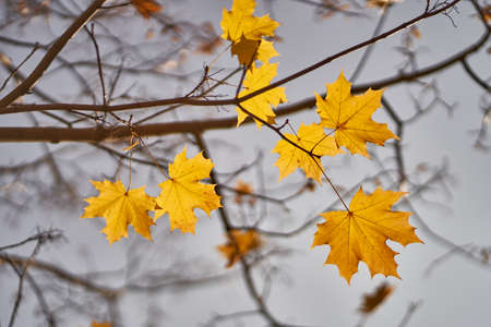 Yellow maple leaves on a branch in the autumn park. Autumn background