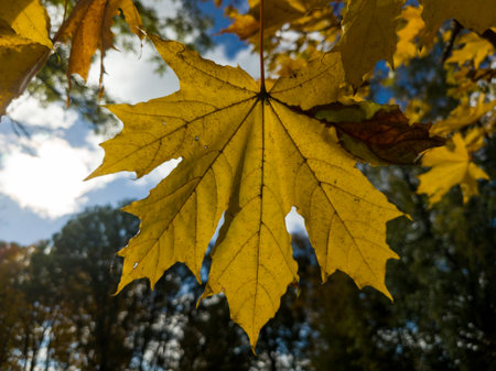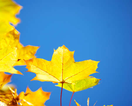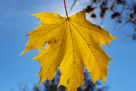 Yellow autumn maple leaf against the blue sky during the fall foliage.