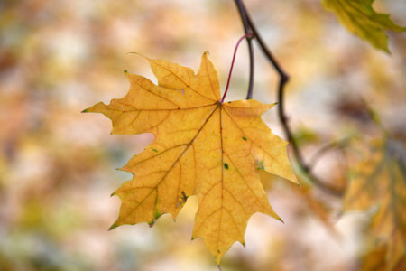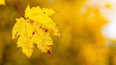 Yellow maple leaf on a branch in the autumn forest. Autumn background