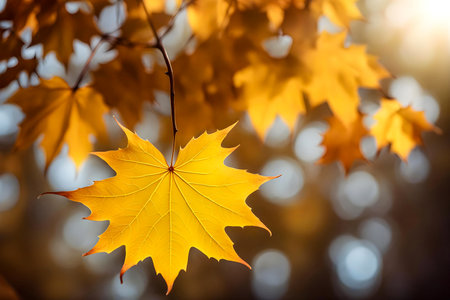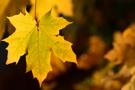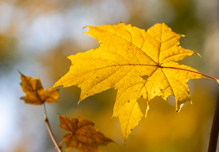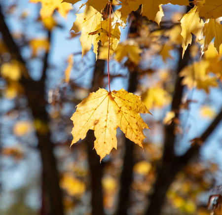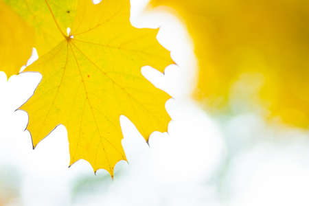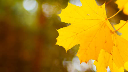 Beautiful maple leaves in autumn sunny day. Yellow leaves in autumn park on blurred background