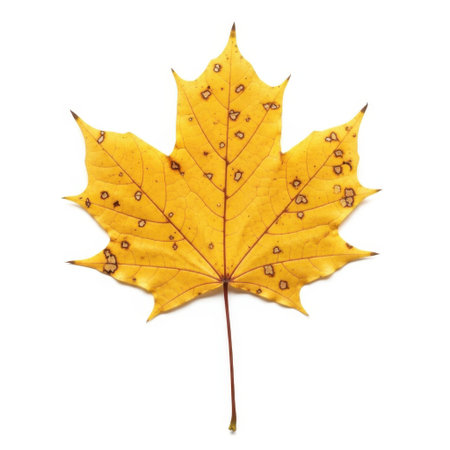 A single autumn leaf with a vibrant yellow hue and scattered brown spots, set against a plain white background. The leaf has a distinct maple shape with five pointed lobes and a central stem.