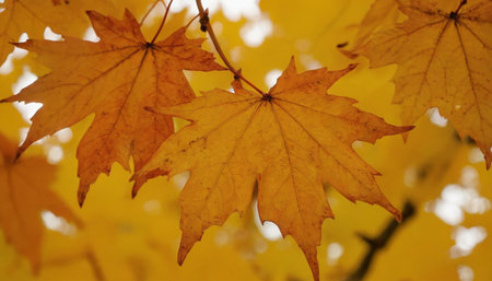 Close-up of vibrant yellow maple leaves illuminated by warm sunlight, showcasing the beauty of autumn foliage.