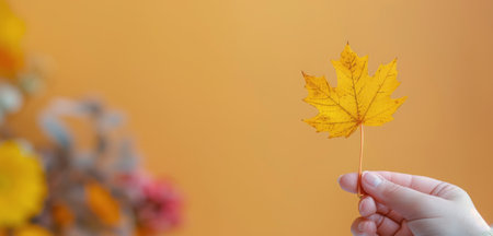 A hand delicately holds a bright yellow maple leaf, contrasting against a vivid orange backdrop, highlighting the beauty of autumn foliage.