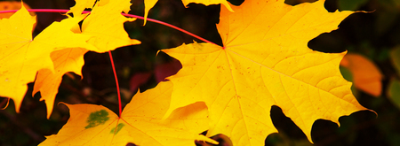 Closeup of golden shining maple leaves in autumn in front of dark background