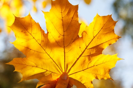 Hand holding a yellow maple leaf close-up on a blurred background, autumn Sunny day. A symbol of autumn.