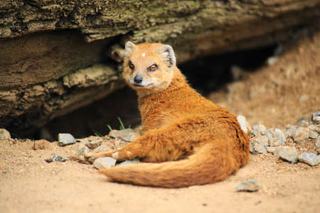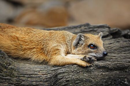 Yellow fox mongoose lies on the ground and rests. Animals of wild nature