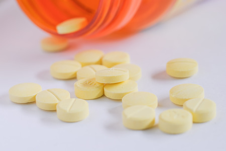 Heap of small yellow tablets (or pills) on white table with blur medicine bottle background