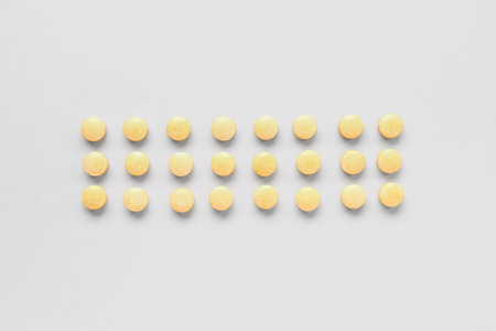 Medical tablets, placed next to each other on a white surface. Therapies, medicines and supplements.