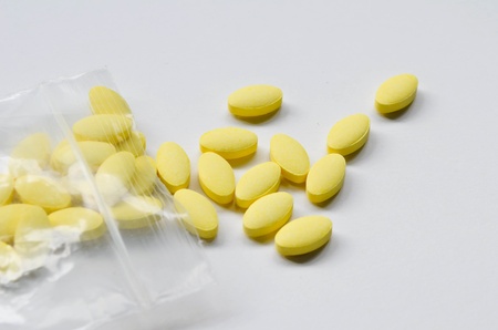 Yellow pills on white background. Focus on foreground, shallow DOF.