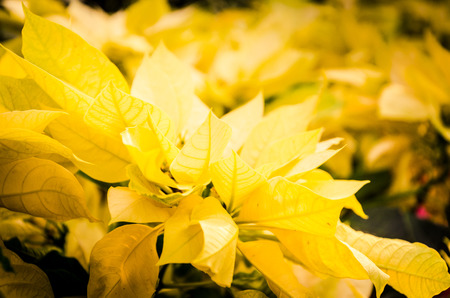 Beautiful nature tropical closeup colorful yellow leaves in a row, tops of Garden Croton or Codiaeum variegatum tree with foliage yellow and green is an ornamental plant in the tropic for background
