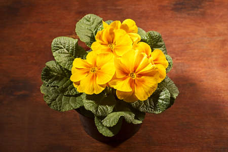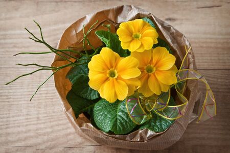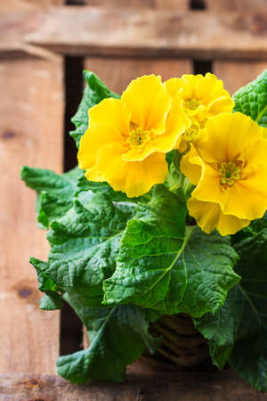 Colorful bright yellow primrose primula polyanthus flowers in a pot on a rustic wooden table. Spring easter garden composition