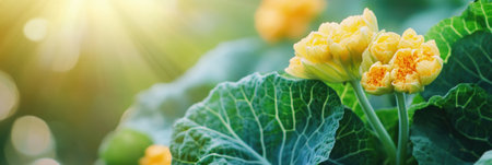 Primula, yellow and green flowers background