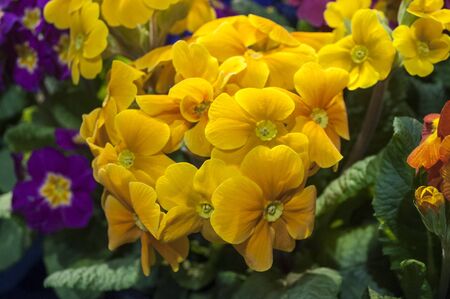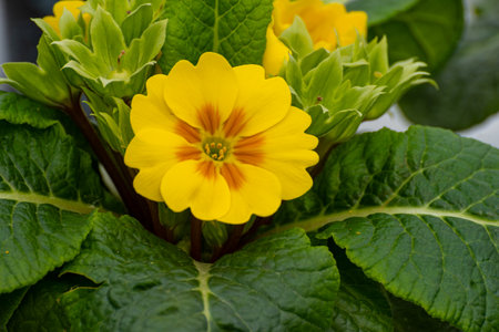 Yellow spring flowers primrose in greenhouse close-up. Petals and stamens primula family primulaceae. Plant auricula and cowslip blossom in commercial glasshouse. Horticulture.